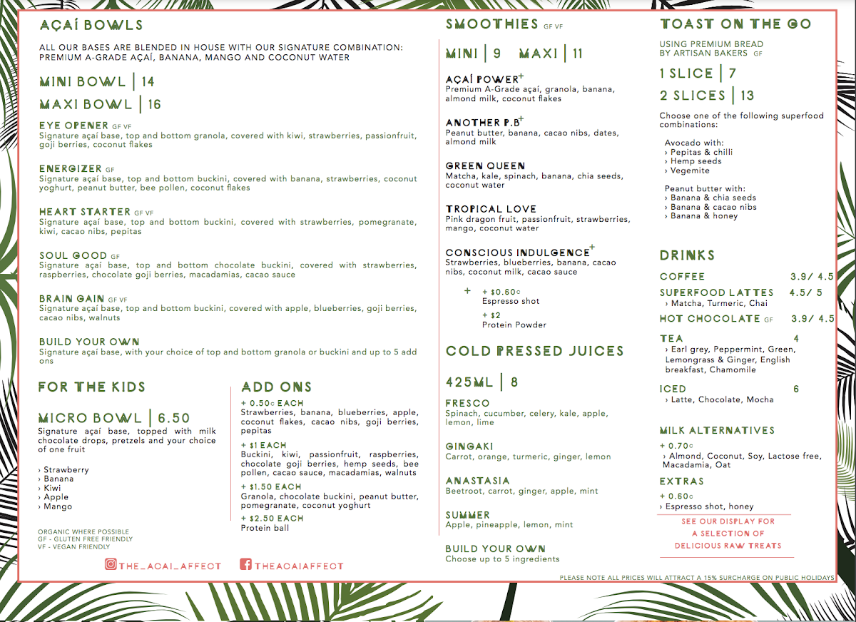The Acai Affect Menu